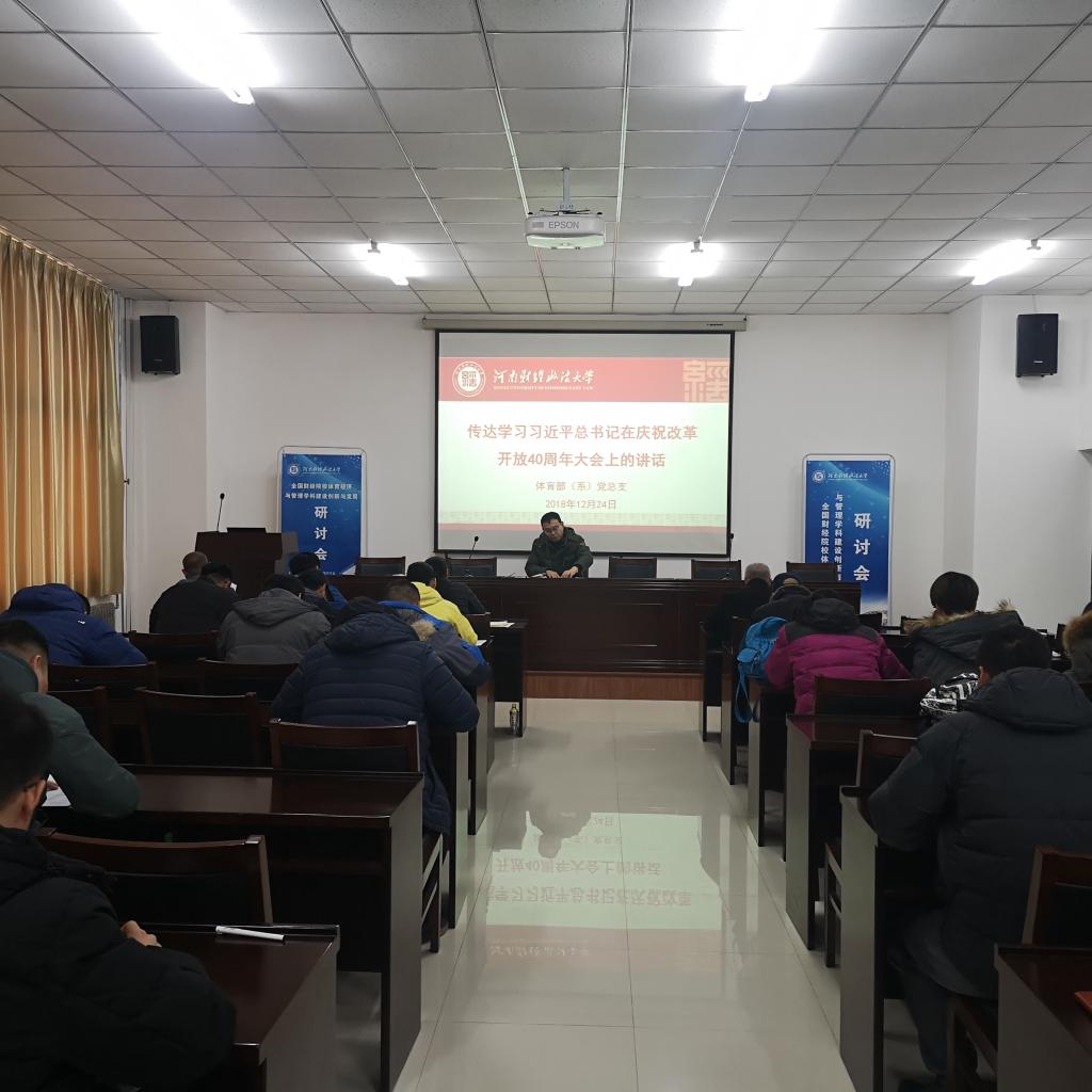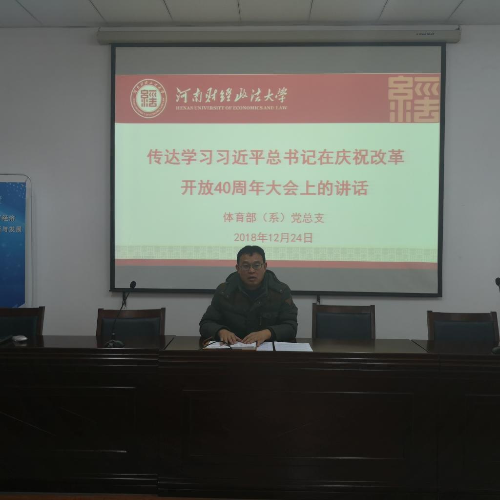 12月24日,体育部召开全体教职工会议,传达学习习近平总书记在庆祝改革开放四十周年大会上的讲话精神。