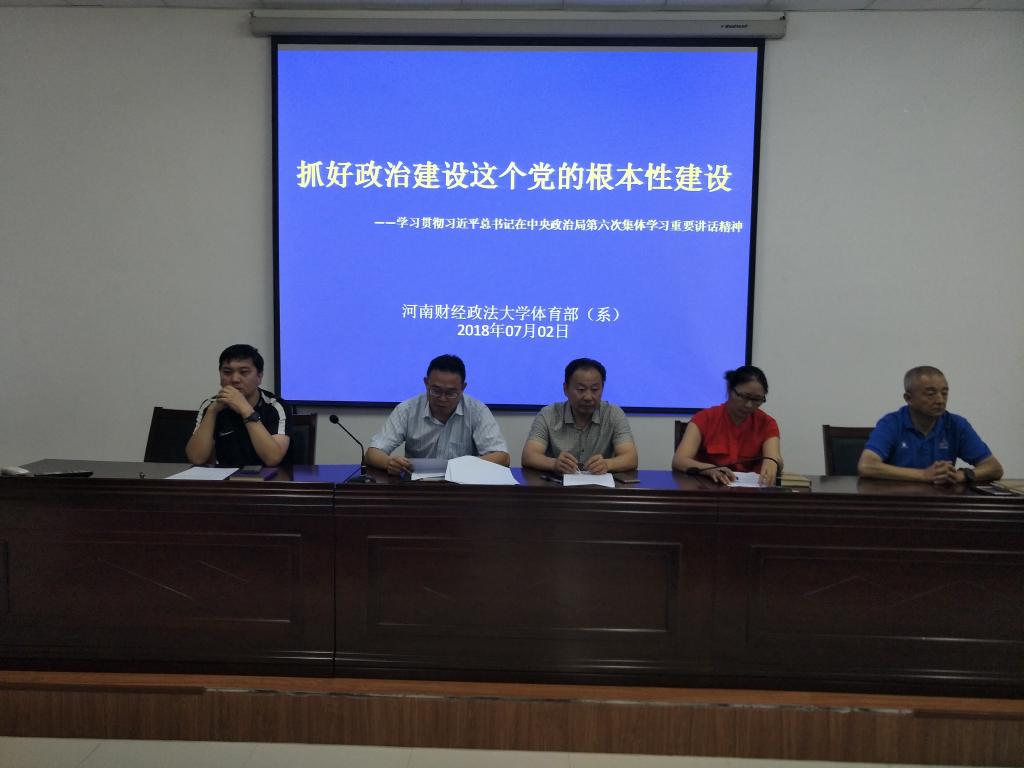 在专题政治理论学习中,体育部党总支书记弓永振组织广大党员认真学习了《抓好政治建设这个党的根本性建设——习近平总书记在中央政治局第六次集体学习重要讲话精神》及校党委书记杨宏志在庆祝中国共产党成立97周年暨表彰大会上的讲话精神。