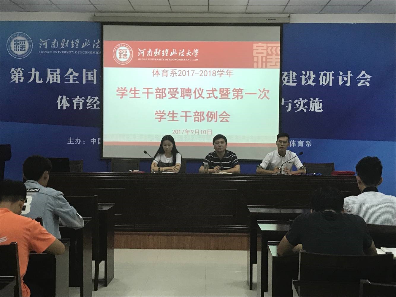2017年9月10日下午我系在会议室召开了“体育系学生干部受聘仪式暨第一次学生干部例会”。参加此次会议的有体育系党总支副书记鲁守璞及全体学生干部。此次会议旨在规范新学期的各项活动,打造一个积极向上、团结和谐的院系氛围,为院系的进一步发展打下坚实的基础。