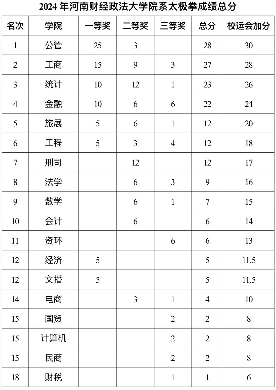 太极拳运动作为学校一项特色健身项目,是“阳光体育运动”的延伸,是各院系、班级集体意识、竞争意识、团队合作精神的综合展示。希望同学们把本次比赛激发出来的合作理念、集体观念、拼搏精神、竞争意识贯彻到日常学习和生活中,让大学生活更加绚丽多彩。