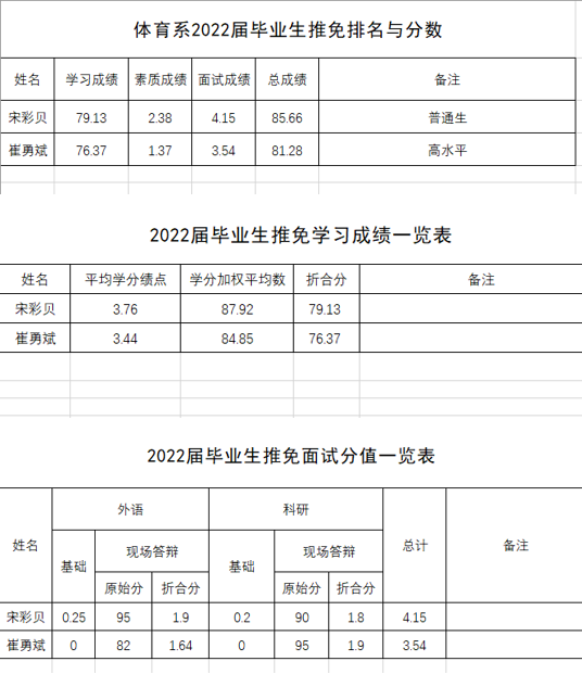 根据教育部和《william威廉中文推荐优秀应届本科毕业生攻读硕士学位工作管理办法》(河财政文【2018】18号)的精神,以及《体育部(系)2022届优秀应届本科毕业生推免攻读硕士学位研究生遴选工作实施细则》的有关要求,共收到3份符合报名条件学生的申请表,最终1名学生撤回报名表。9月7日,体育部(系)对两名学生进行了专业外语能力和专业知识的面试。根据综合成绩排名予以公示。监督举报电话:86255911。