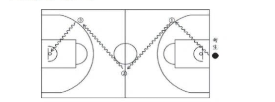(1)测试方法:学生在球场端线中点外出发区持球站立,当其进入端线后开始计时。考生用右手运球至①处,在①处做背后运球,换左手向②处运球,在②处做左手后转身运球,换右手运球至③处,在③处做右手胯下运球后右手上篮。球中篮后方可左手运球返回③处,在③处做左手背后运球,换右手向②处运球,在②处做右手后转身运球,换左手向①处运球,在①处做左手胯下运球后左手上篮。球中后做同样的动作再重复一次最后一次上篮命中后,持球冲出端线,考生身体穿越端线后停止计时,记录完成的时间。