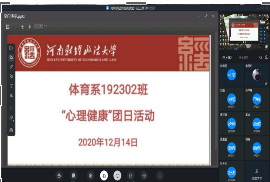 为全面推进素质教育,加强和改进学生心理健康。10月27日,体育系组织2020级新生开展心理健康主题教育班会,兼职辅导员昝笑笑、谢红琳出席,2020级全体学生参加。