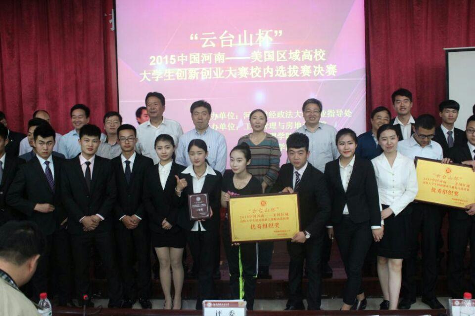 4月29日,由就业指导处主办,工程管理与房地产学院、工商管理学院、文化传播学院承办的“云台山杯”2015中国河南—美国区域高校大学生创新创业大赛校内选拔赛决赛在教1-220报告厅举行,副校长司林胜和就业指导处、各院系负责人参加了本次活动。体育系经世体育公共服务有限公司团队表现出色,获得优异成绩。