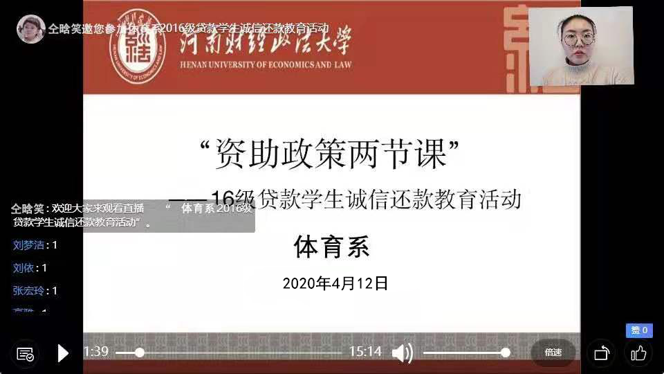 4月12日,由于疫情的原因,我系在网上通过钉钉会议举办了资助政策两节课——诚信还款的会议,该会议由体育系团总支书记仝晗笑主持,体育系2020届贷款毕业生参加。